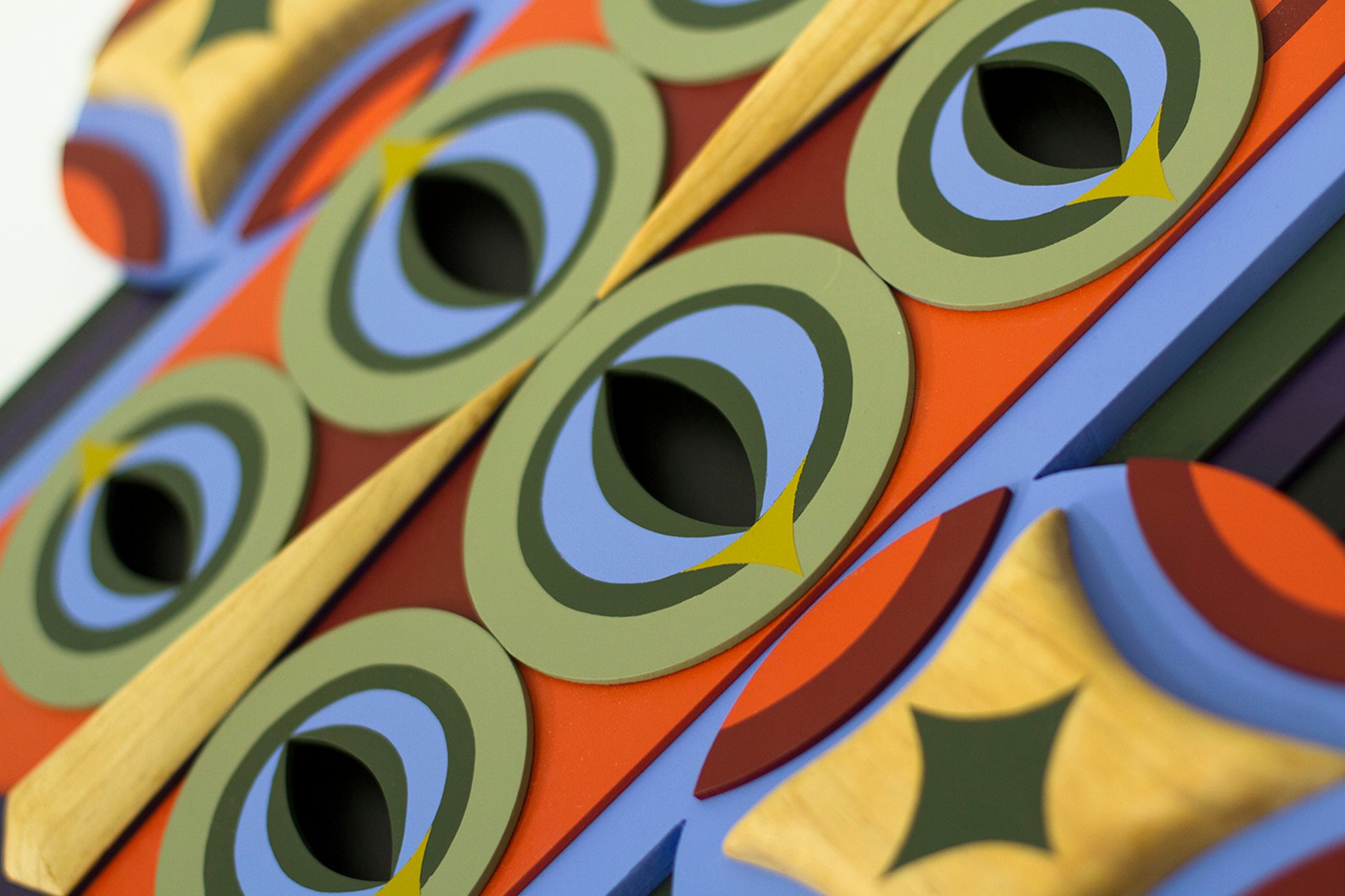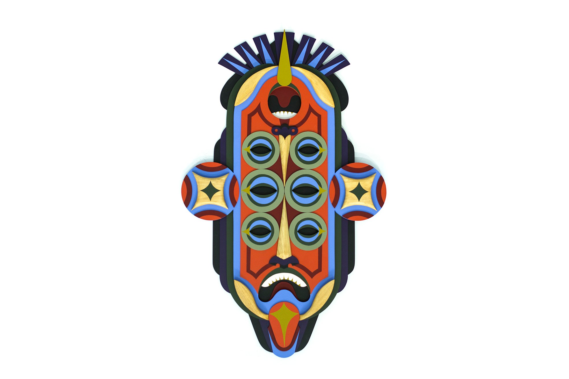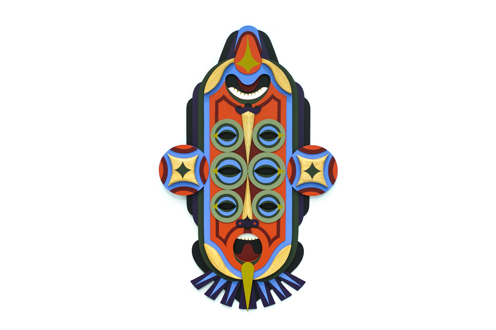 Namaqua is a fully handcrafted double-sided mask, designed to be hung and display both faces. The piece belongs to a series named after communities and cultures at risk of disappearance due to human exploitation.