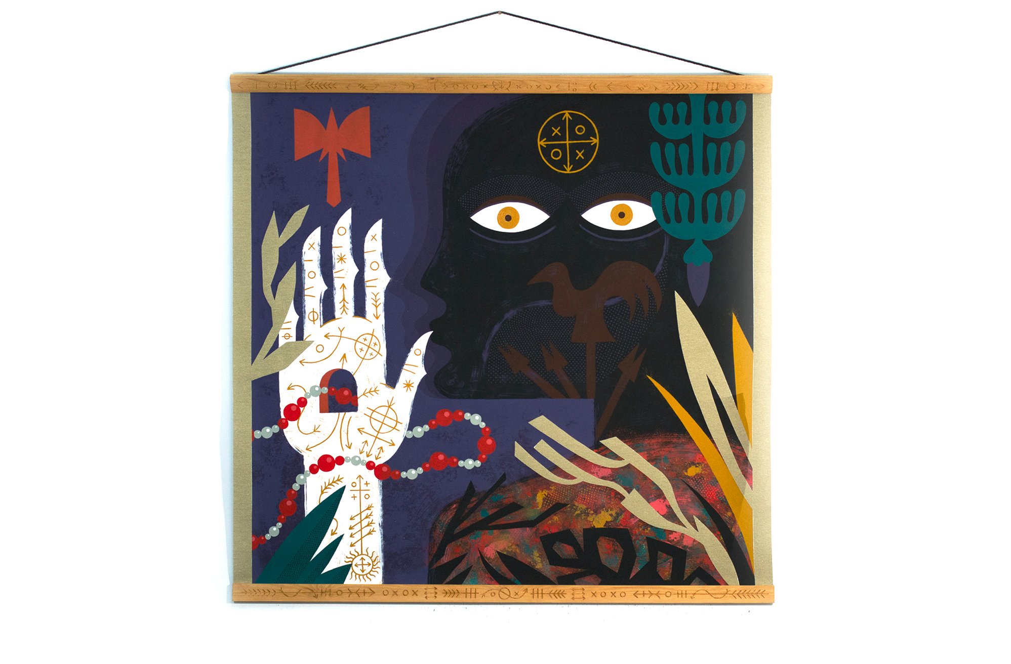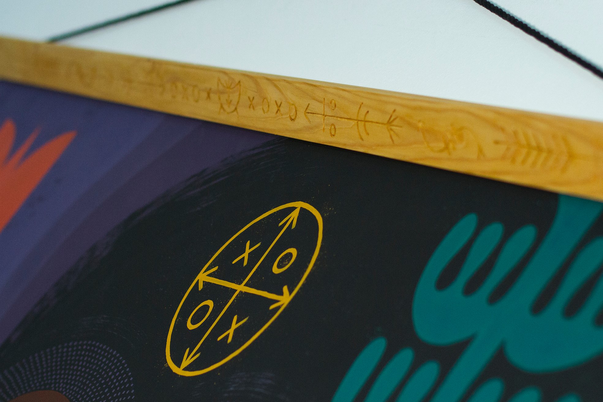 Acrylic on canvas with hand-engraved wooden frame. One of a kind piece.